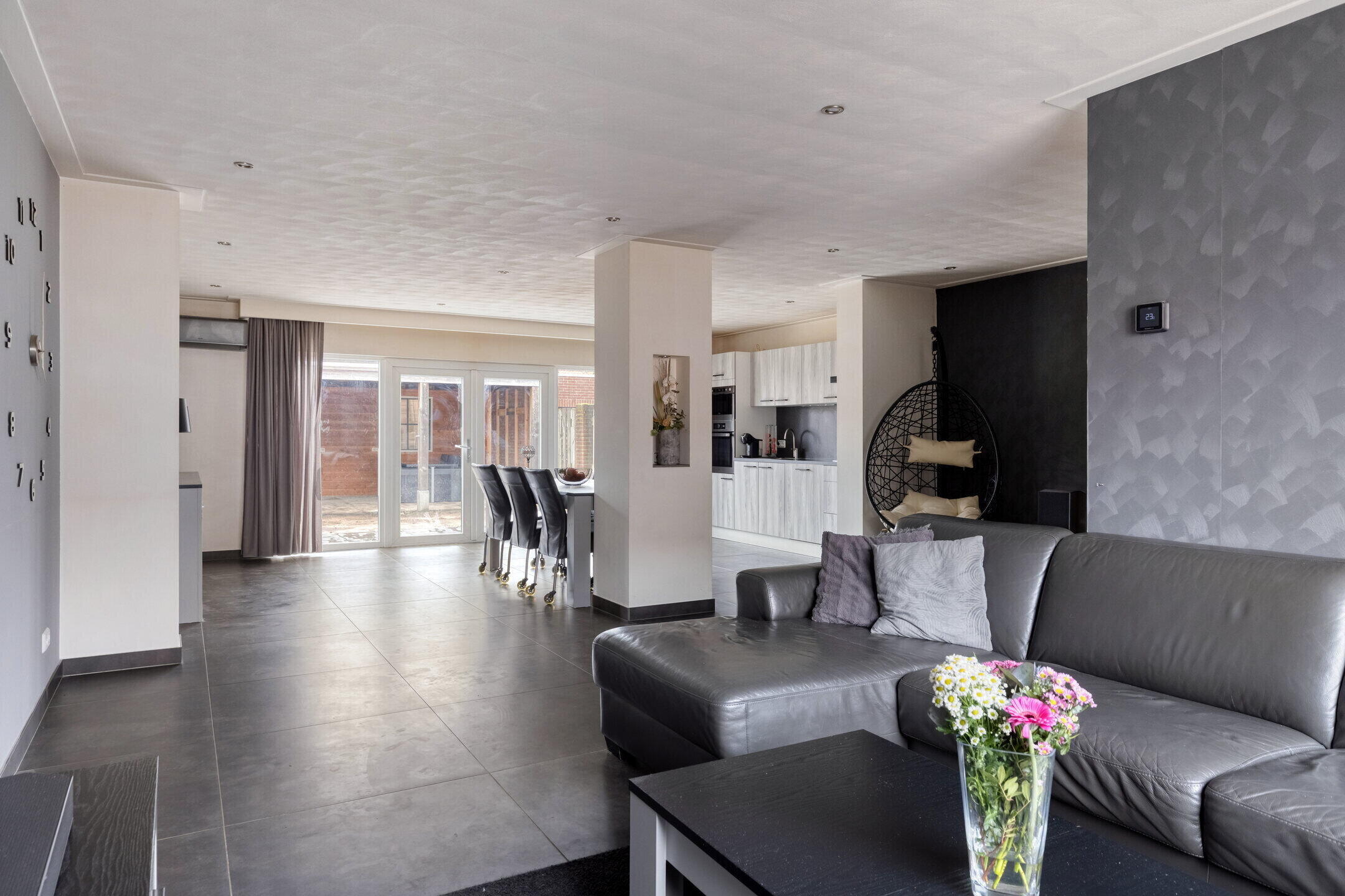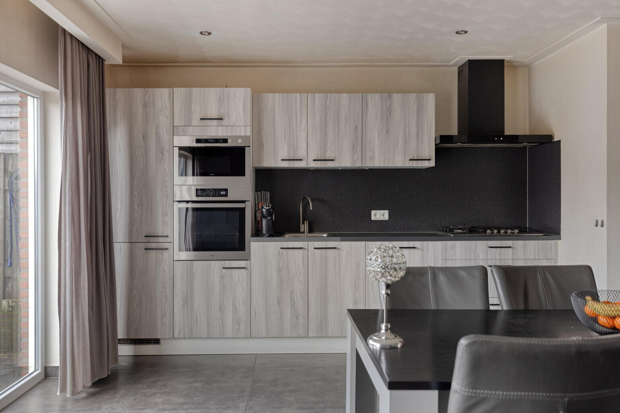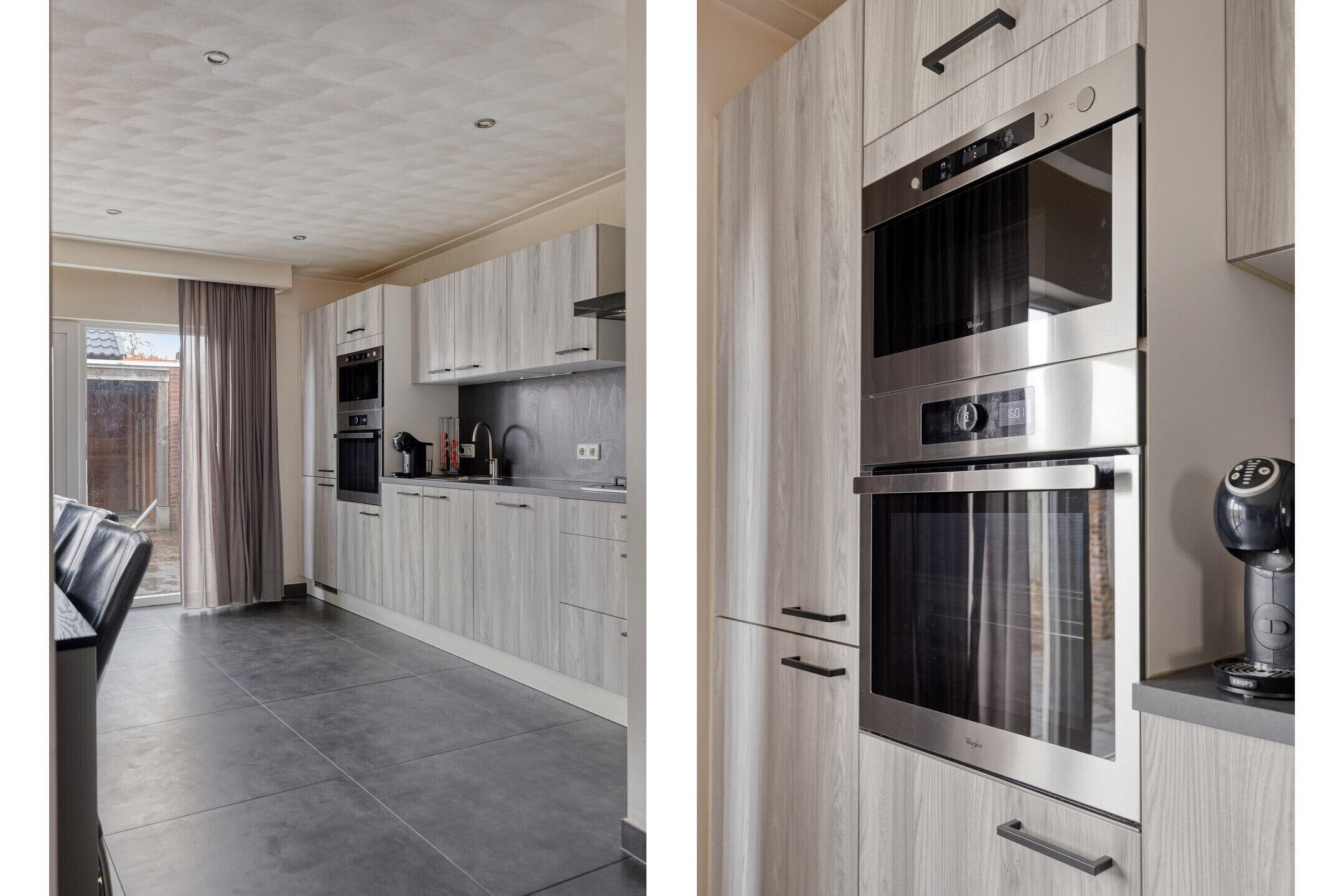 De uitgebouwde woonkamer is heerlijk ruim en licht, met een mooie antraciet tegelvloer en strak afgewerkte wanden. Aan de voorzijde is voldoende ruimte voor een comfortabele zithoek, terwijl je aan de achterzijde dankzij de uitbouw perfect een grote eettafel voor zes personen kwijt kunt. Hier geniet je van gezellige diners met familie en vrienden! Aansluitend aan het eetgedeelte vind je de strakke open keuken in antracietkleur met een grijs werkblad. De opstelling biedt volop werkruimte en de keuken is voorzien van luxe inbouwapparatuur: een 5-pist gaskookplaat, afzuigkap, oven, combi-oven, koel-vriescombinatie, vaatwasser én een close in boiler. Dankzij de ingebouwde spotjes heb je altijd perfect licht. Vanuit de keuken heb je bovendien toegang tot de achtertuin.