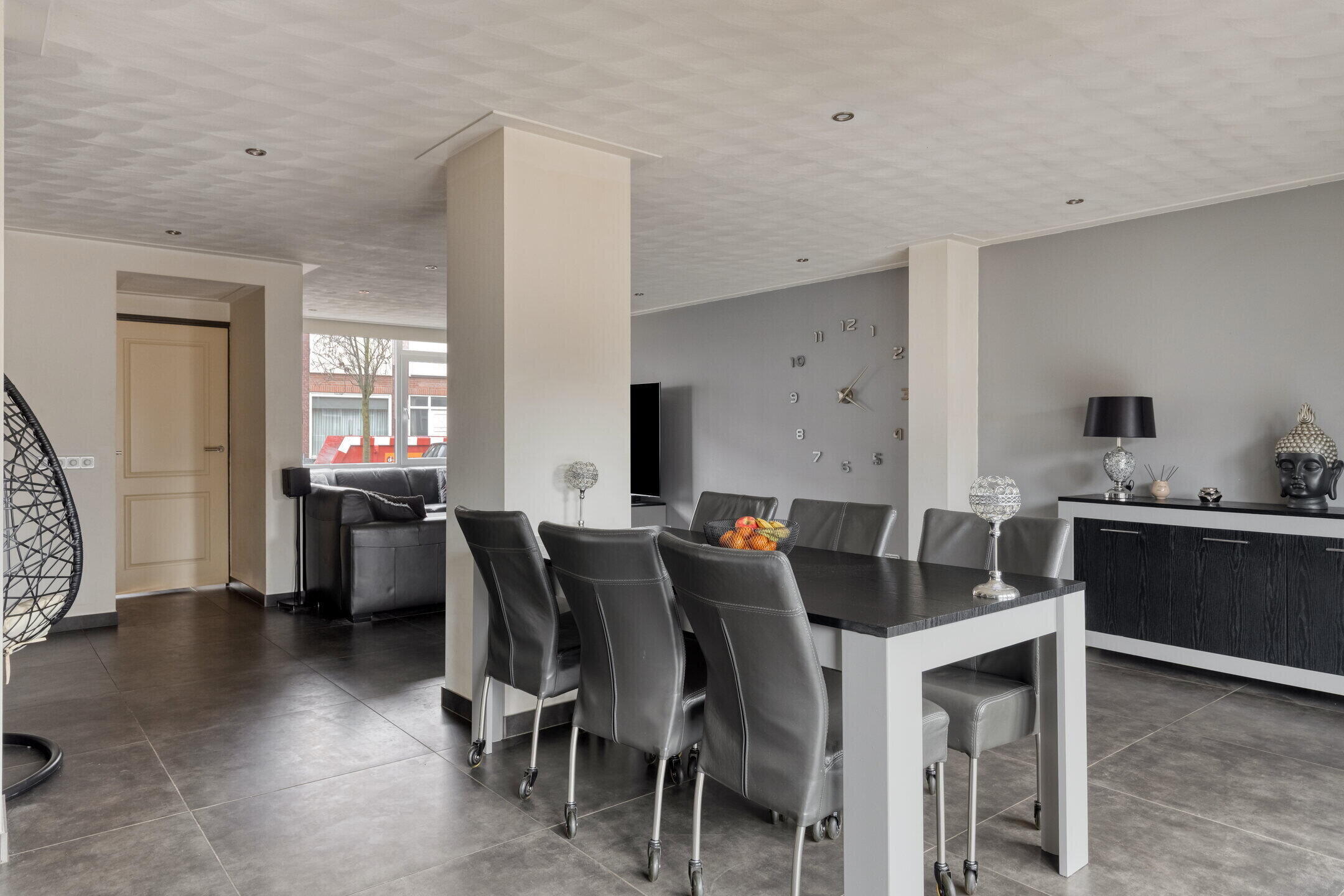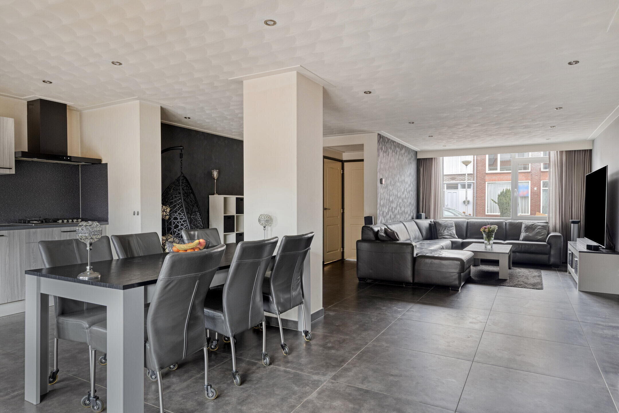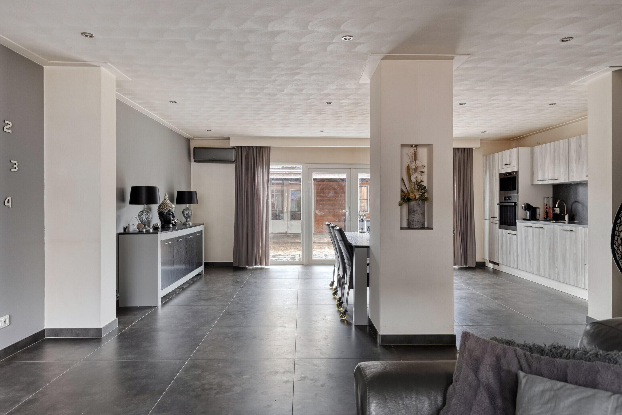 De uitgebouwde woonkamer is heerlijk ruim en licht, met een mooie antraciet tegelvloer en strak afgewerkte wanden. Aan de voorzijde is voldoende ruimte voor een comfortabele zithoek, terwijl je aan de achterzijde dankzij de uitbouw perfect een grote eettafel voor zes personen kwijt kunt. Hier geniet je van gezellige diners met familie en vrienden! Aansluitend aan het eetgedeelte vind je de strakke open keuken in antracietkleur met een grijs werkblad. De opstelling biedt volop werkruimte en de keuken is voorzien van luxe inbouwapparatuur: een 5-pist gaskookplaat, afzuigkap, oven, combi-oven, koel-vriescombinatie, vaatwasser én een close in boiler. Dankzij de ingebouwde spotjes heb je altijd perfect licht. Vanuit de keuken heb je bovendien toegang tot de achtertuin.