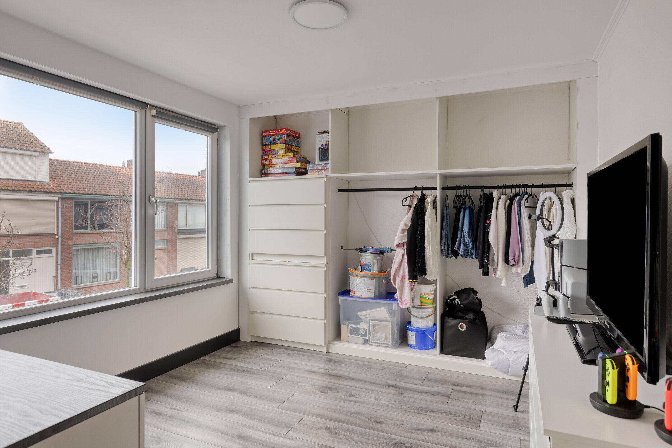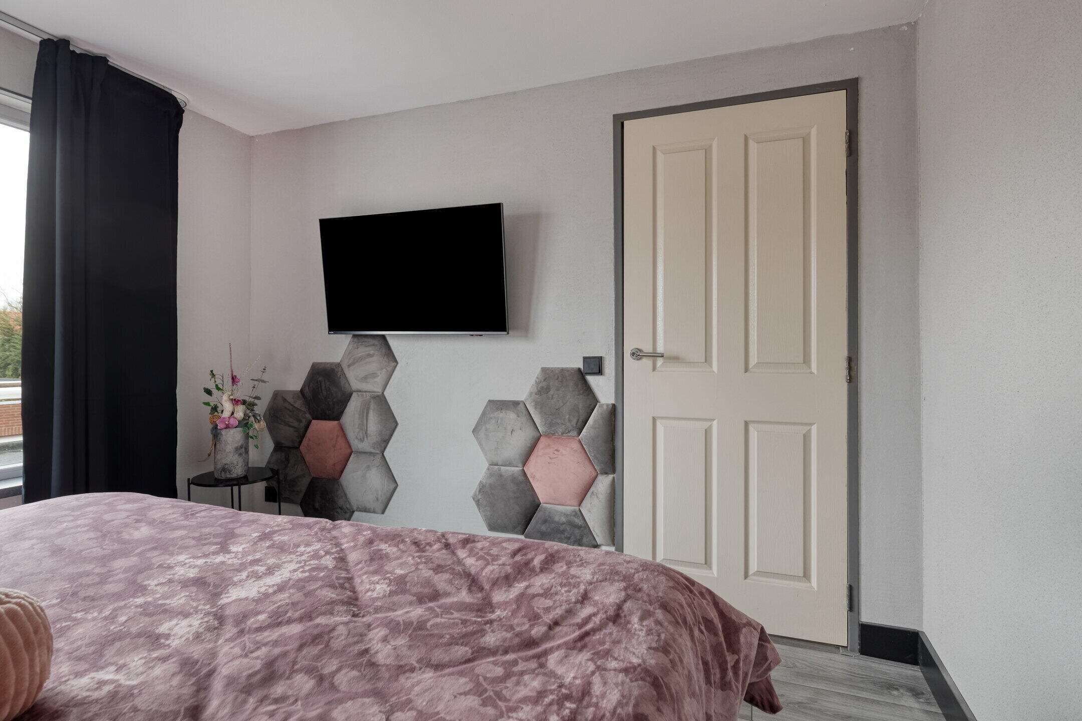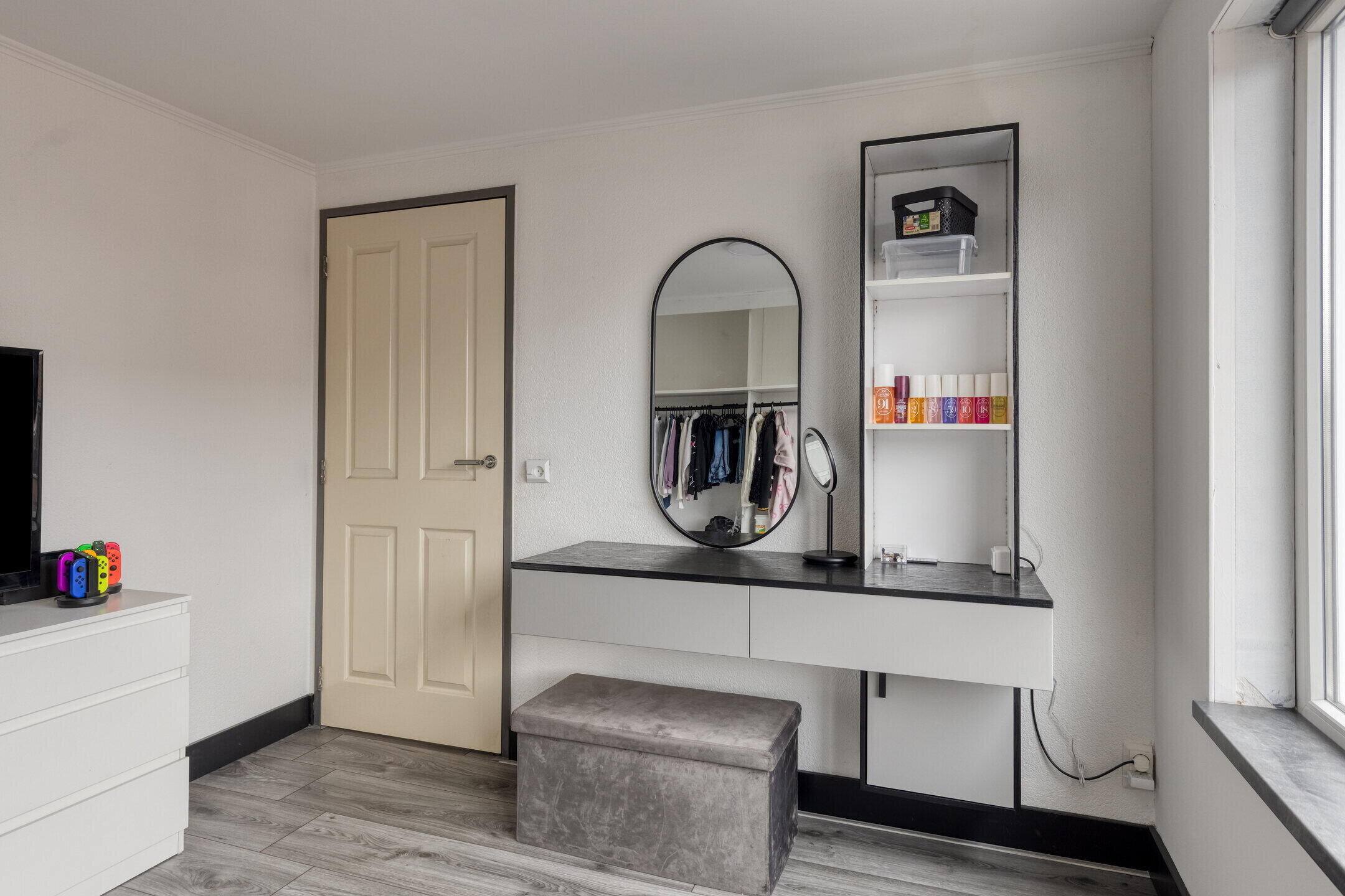 Op de eerste verdieping kom je op de overloop, die toegang biedt tot twee kamers. De hoofdslaapkamer aan de achterzijde is ruim genoeg voor een kingsize bed, terwijl de slaapkamers aan de voorzijde perfect geschikt zijn als kinder- of werkkamer. Daarnaast is er naast de trapopgang nog ruimte voor het plaatsen van de wasmachine en droger, ideaal en makkelijk bereikbaar. Beide kamers zijn voorzien van airco en een nette laminaatvloer en strak afgewerkte wanden, waardoor de hele verdieping een verzorgde en moderne uitstraling heeft.