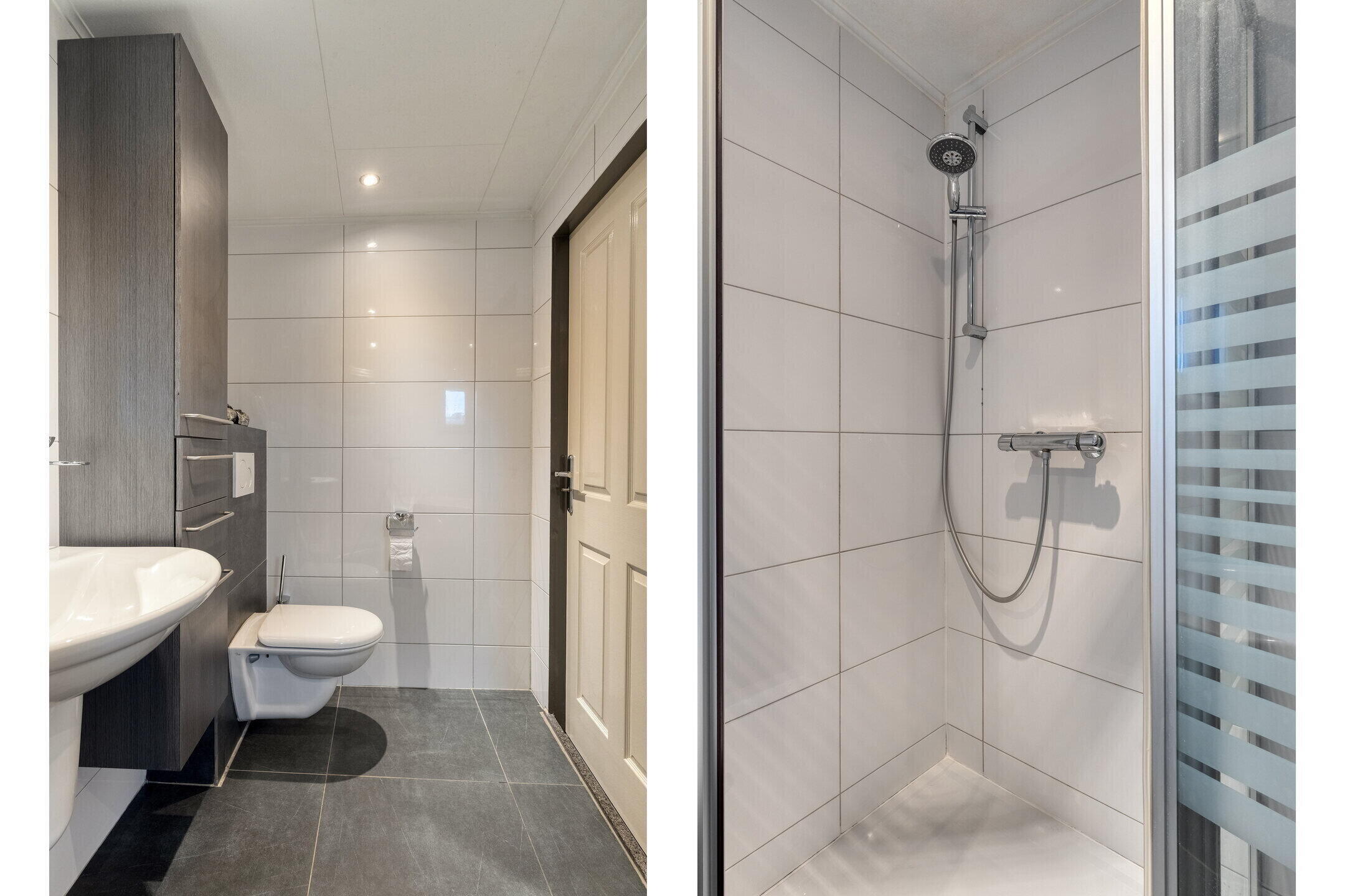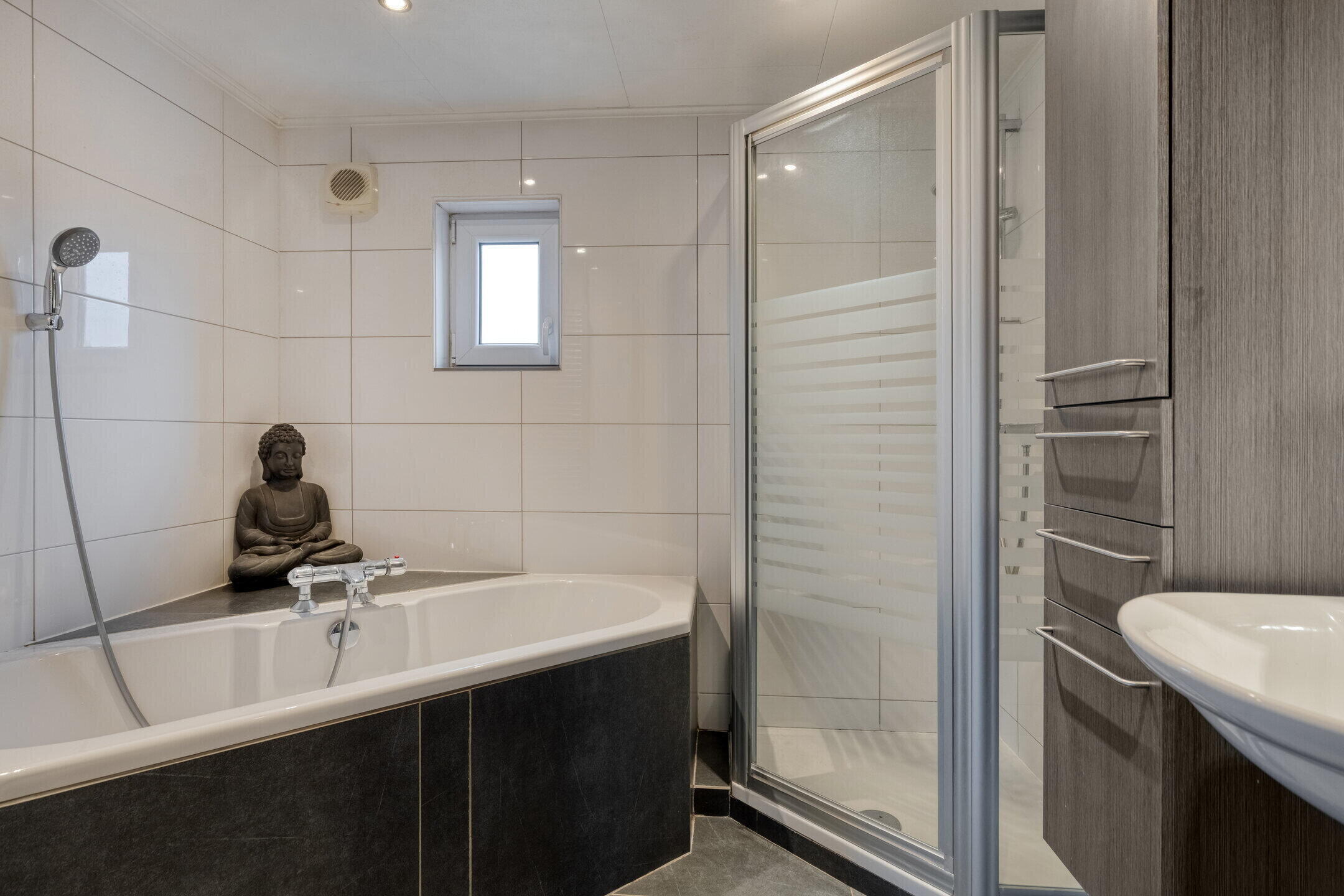 De badkamer is stijlvol en modern, met grijze en witte tegels, en is voorzien van een ligbad, wc, inloopdouche een wastafelmeubel. Perfect om de dag fris te beginnen.
